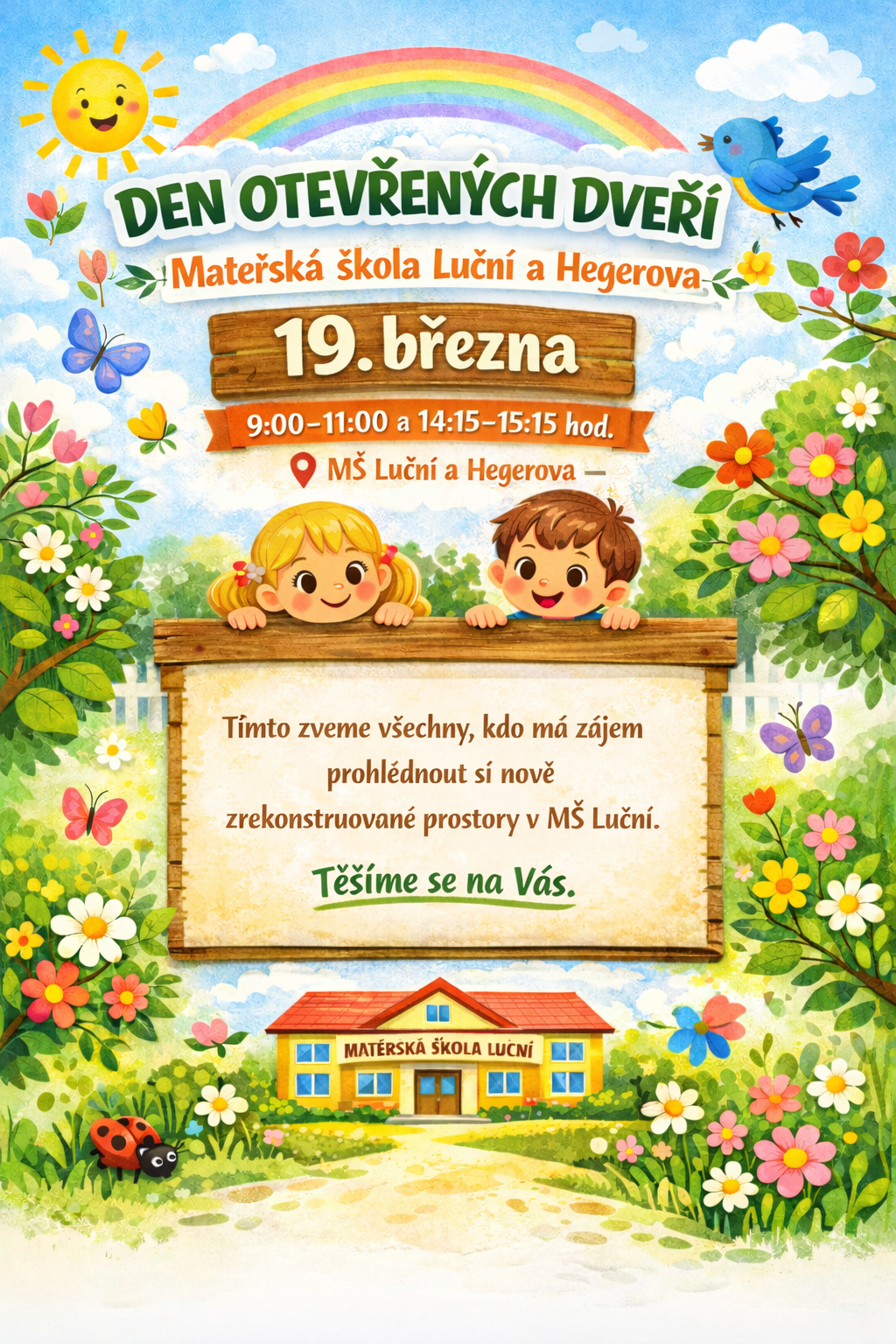 Napsal Lenka Červená Zveřejněno: 13. únor 2026 Den otevřených dveří Přijměte naše pozvání na návštěvu MŠ Luční a Hegerova v rámci zápisu do mateřské školy a k nahlédnutí na nově zrekonstruované prostory v MŠ Luční. Přílohy: Den otevřených dveří v MŠ Luční.png[ ]2670 kB